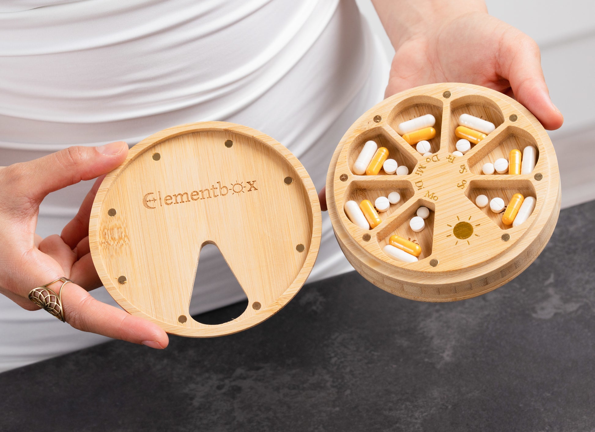 Die Pillenbox begeistert mit elegantem, doppelseitigem Design für deine goldene Morgenstunde und deine silberne Abendstunde☀️&🌙